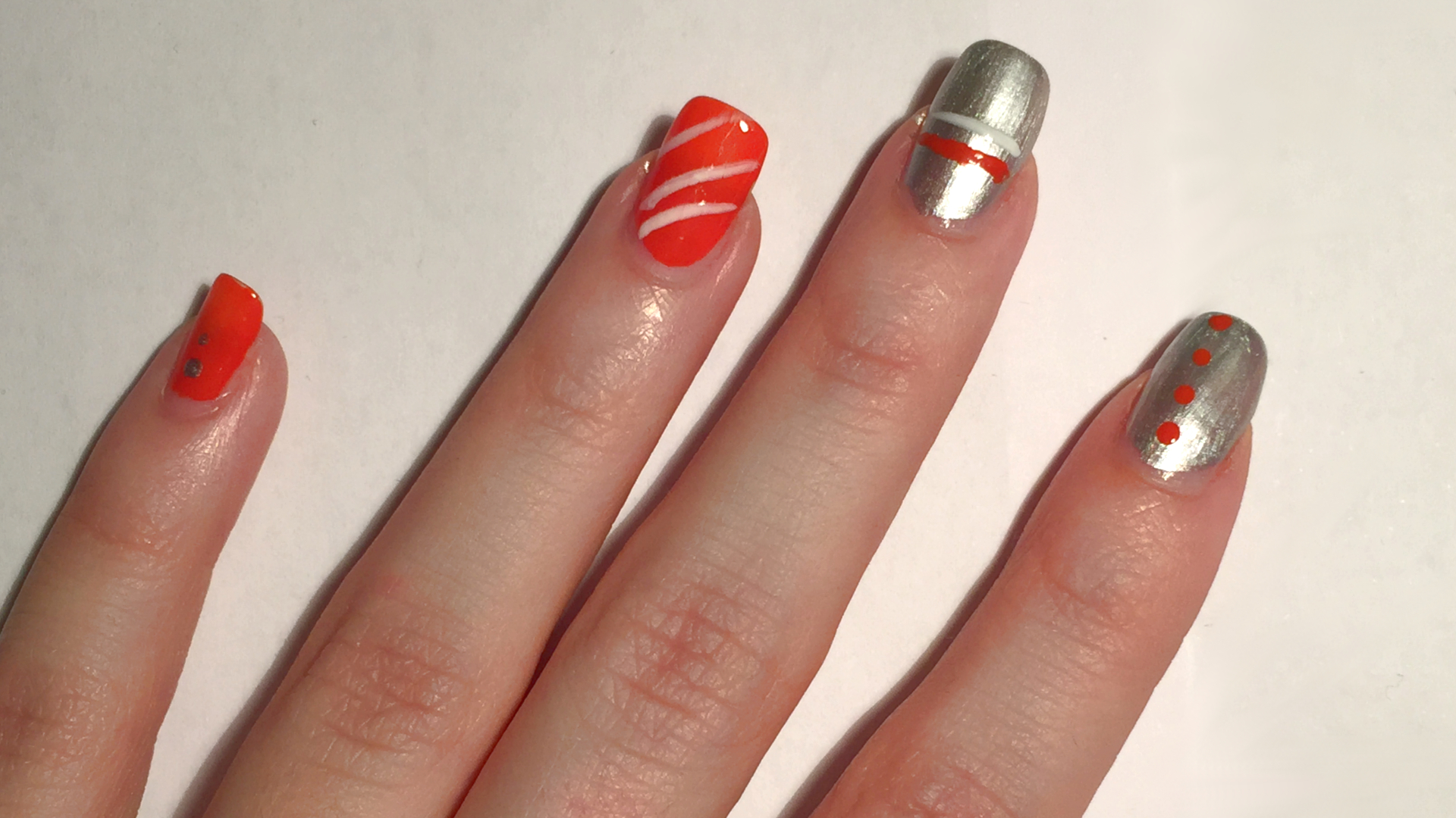 - Step 7: Den neon orangen kleinen Finger habe ich mit zwei metallic silbernen Punkten hervorgehoben