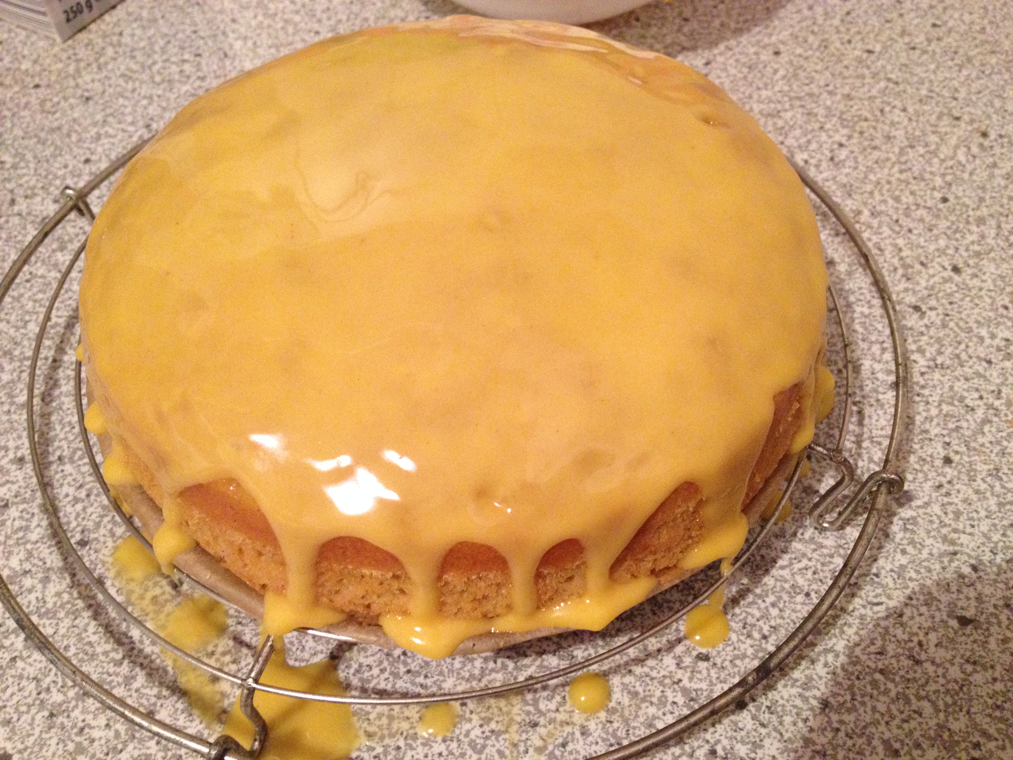 1. Mische einen zähflüssigen Zuckerguss aus Puderzucker, Curcuma und Wasser. Curcuma gibt dem Guss eine gelb-orange Farbe. Pass auf, dass du nicht zu viel erwischt, sonst schmeckt der Kuchen nach Curry. Ein leichter Geschmack ist aber okay, der fällt später nicht mehr auf. Glasiere den Kuchen.