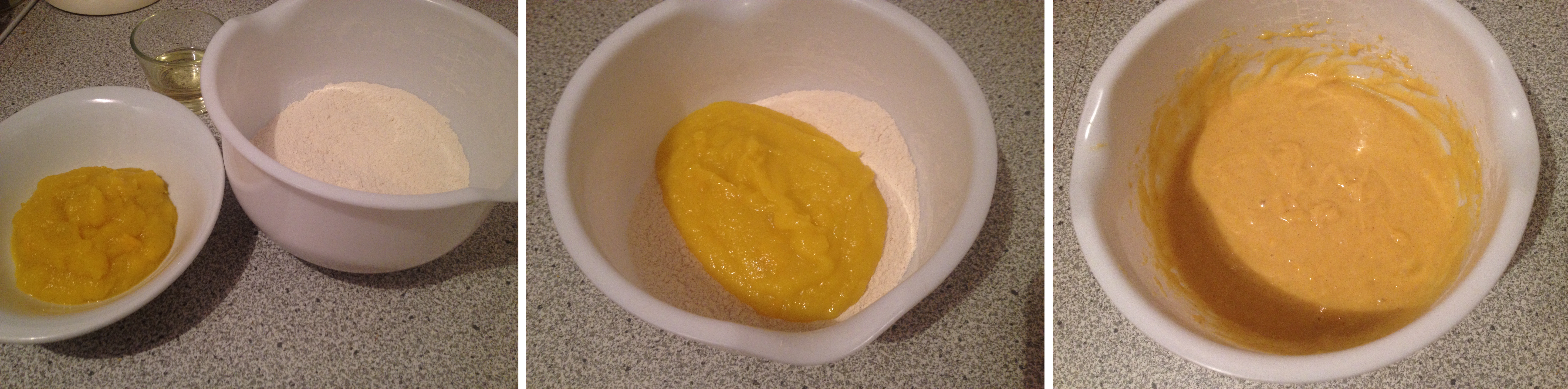 2. Mische die trockenen Zutaten in einer Schüssel und das Kürbispürree mit dem Öl in einem anderen Behälter.
