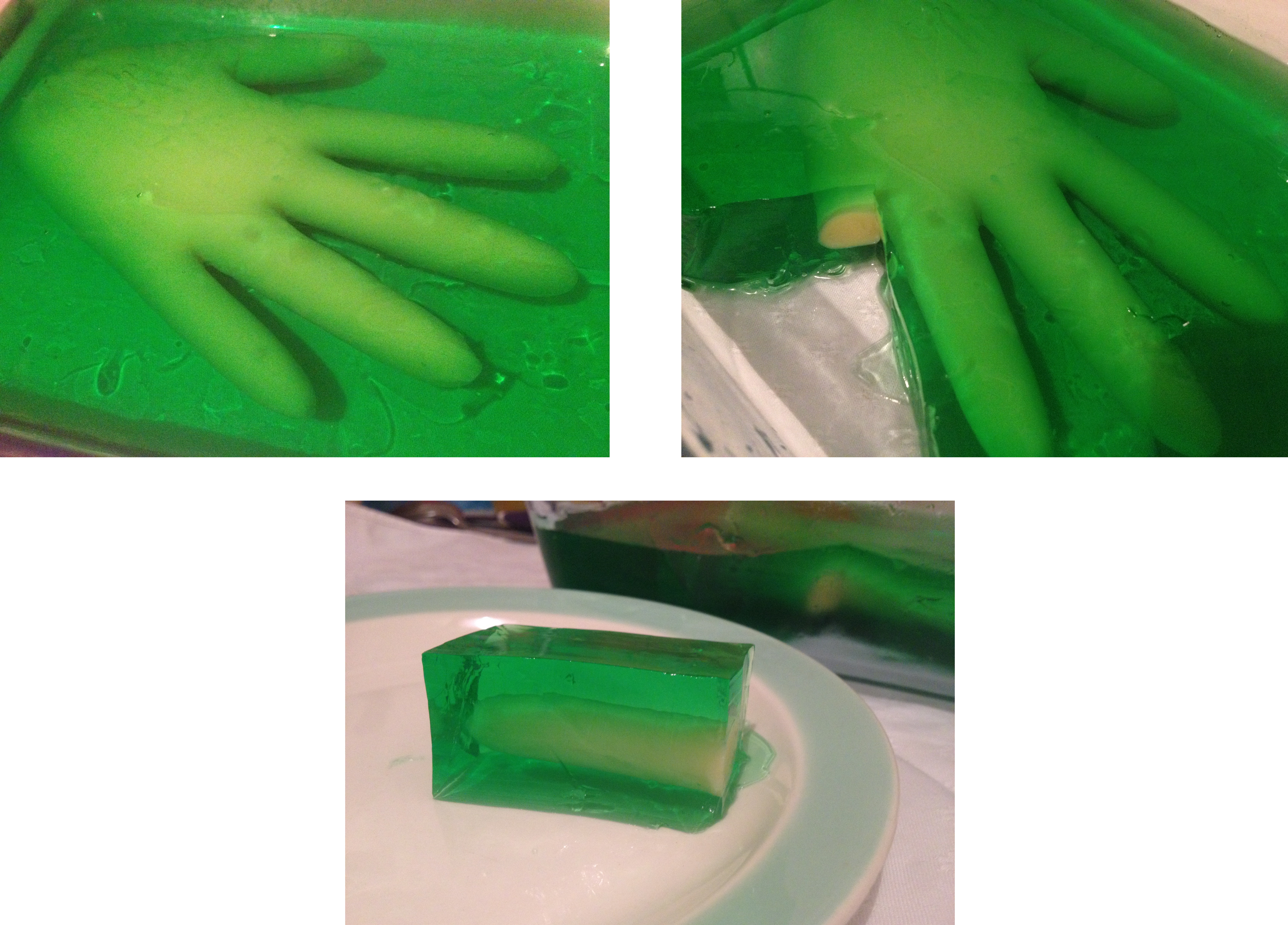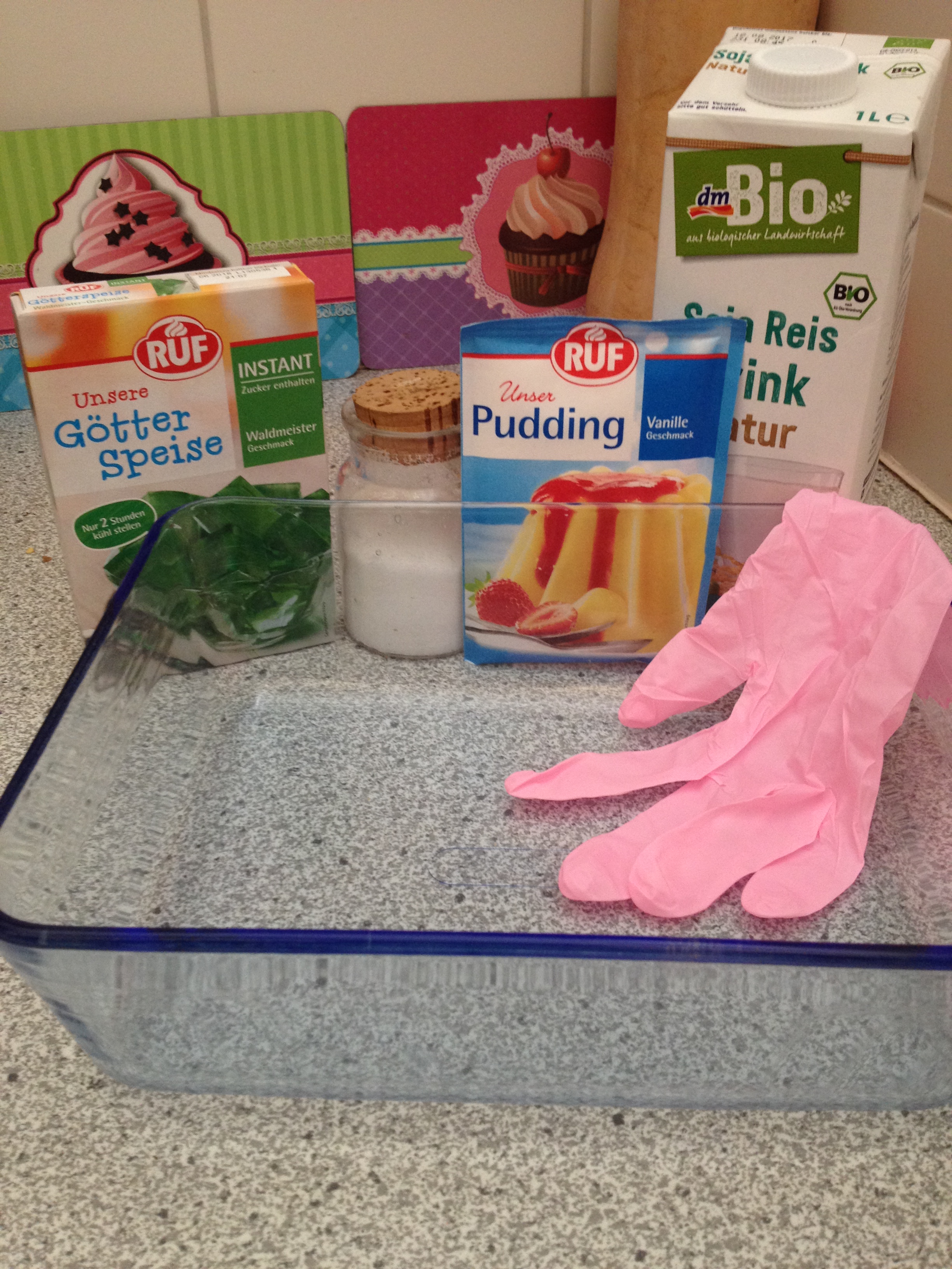 3. Bereite die Götterspeise nach Packungsanleitung zu, also einfach mit heißem Wasser übergießen. Warte dann ein bisschen, bis er leicht andickt und nicht mehr ganz so heiß ist. Ich habe dafür ein bisschen gerührt und ihn mit einem Fächer gekühlt. Wenn er nur noch warm ist und sich oben schon eine Haut bildet, kannst du die gefrorene Hand aus Pudding in die Götterspeise legen.