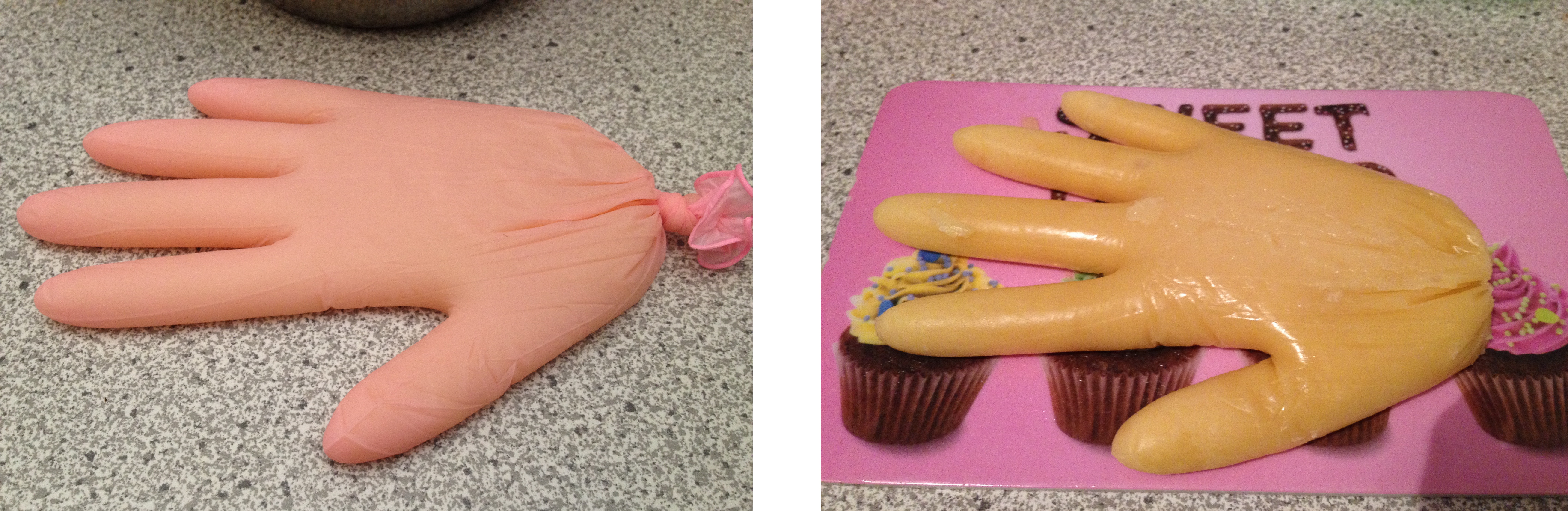 2. Wasche den Latex-Handschuh gut aus. Wenn er trocken ist, kannst du ihn mit dem fertigen Pudding befüllen, damit er darin abkühlen kann. Achte darauf, dass keine Luft mit eingeschlossen wird, vor allem in den Fingern. Verknote dann den handschuh und lege ihn flach und mit leicht gespreizten Fingern auf ein Brett. So kannst du ihn in die Gefriertruhe legen, sodass der Pudding gut durchfriert und später die Form beibehält (die Konsistenz verändert sich dadruch ein bisschen). Nach einigen Stunden schneidest du den Handschuh einfach auf und hast die fertige Hand aus Pudding.