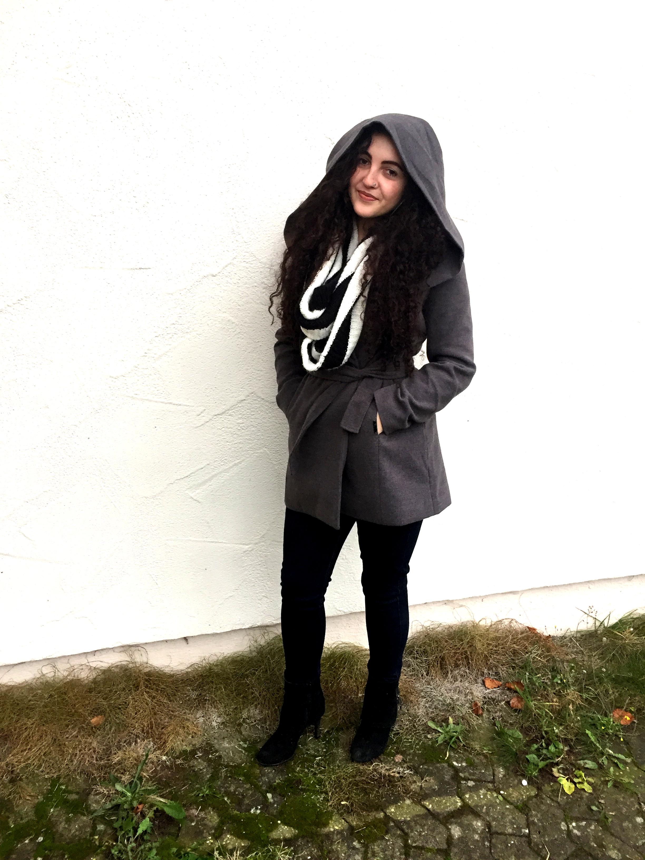 Um ein bisschen Farbe ins Spiel zu bringen, habe ich mein Winteroutfit mit einer bunt gestreiften Strickjacke ergänzt. Doch es wird ganz deutlich, wie viel der Schal alleine ausmacht. Obwohl er sehr schlicht ist, verleiht er dem gesamten Look das gewisse Etwas. Er passt sich dem Look wunderbar an und macht ihn nochmal kuscheliger. Einer meiner liebsten Styles an kalten Tagen. Den Schal kannst du natürlich ganz unterschiedlich binden. Ein paar Möglichkeiten werden wir demnächst auch auf Nimm-s zeigen.