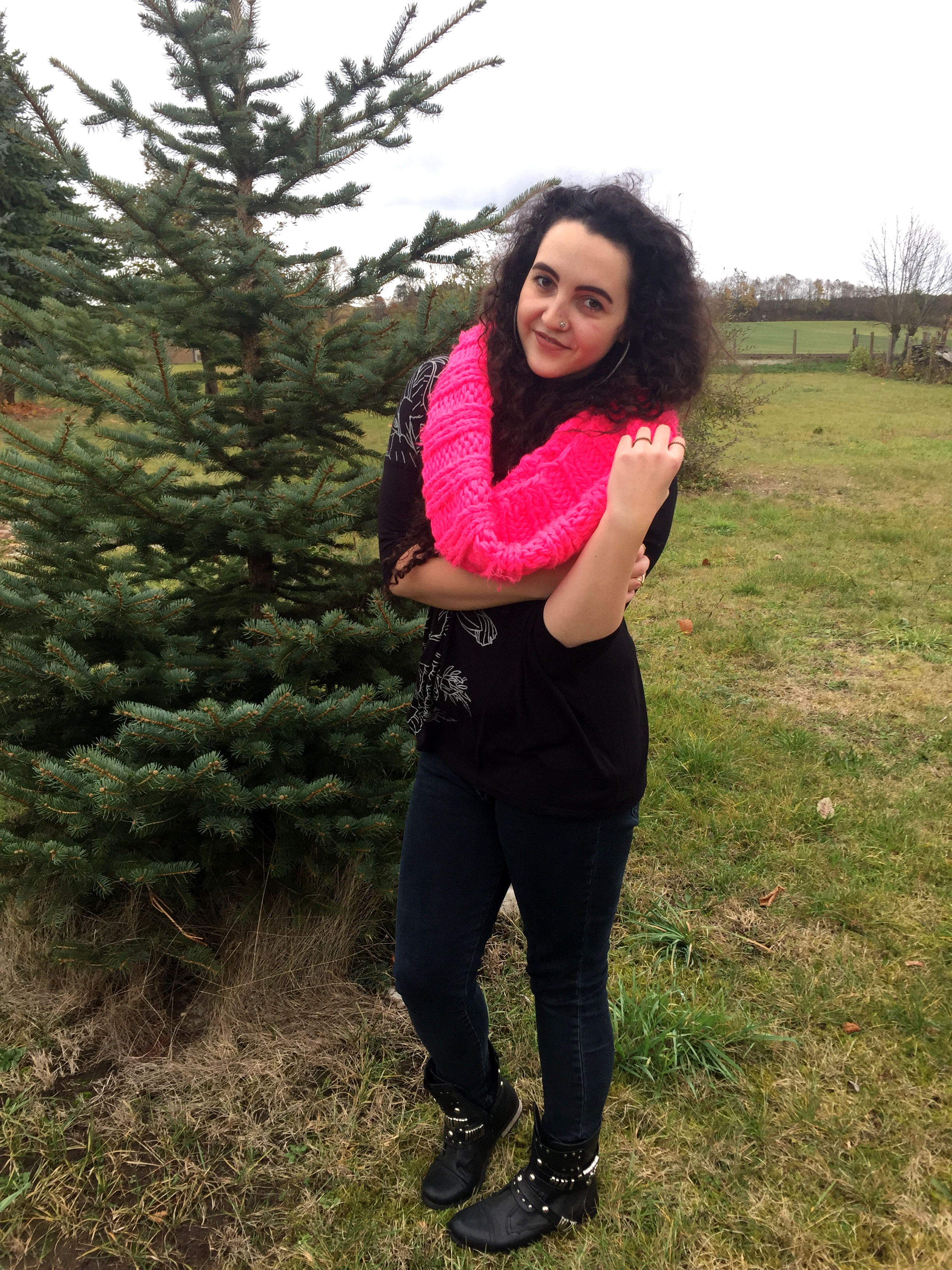 Um dem Komplettlook in schwarz aufregender zu gestalten, eignen sich Knallfarben als besonderes Highlight – so etwa mit einem schönen Strickschal. Er ist das perfekte Accessoire, um dem Look eine auffällige Komponente zu verleihen. Da ich ein großer Freund von Farbe und dem Experimentieren, auch in modischer Hinsicht, bin, gefällt mir der Schwarz Neon Kontrast sehr gut. Wer sagt denn auch, dass pink nur was für den Sommer ist? Besonders jetzt brauchen wir doch diese knalligen Lichtblicke, die den Tag erhellen. Also nur Mut zur Farbe. Umso greller umso besser!