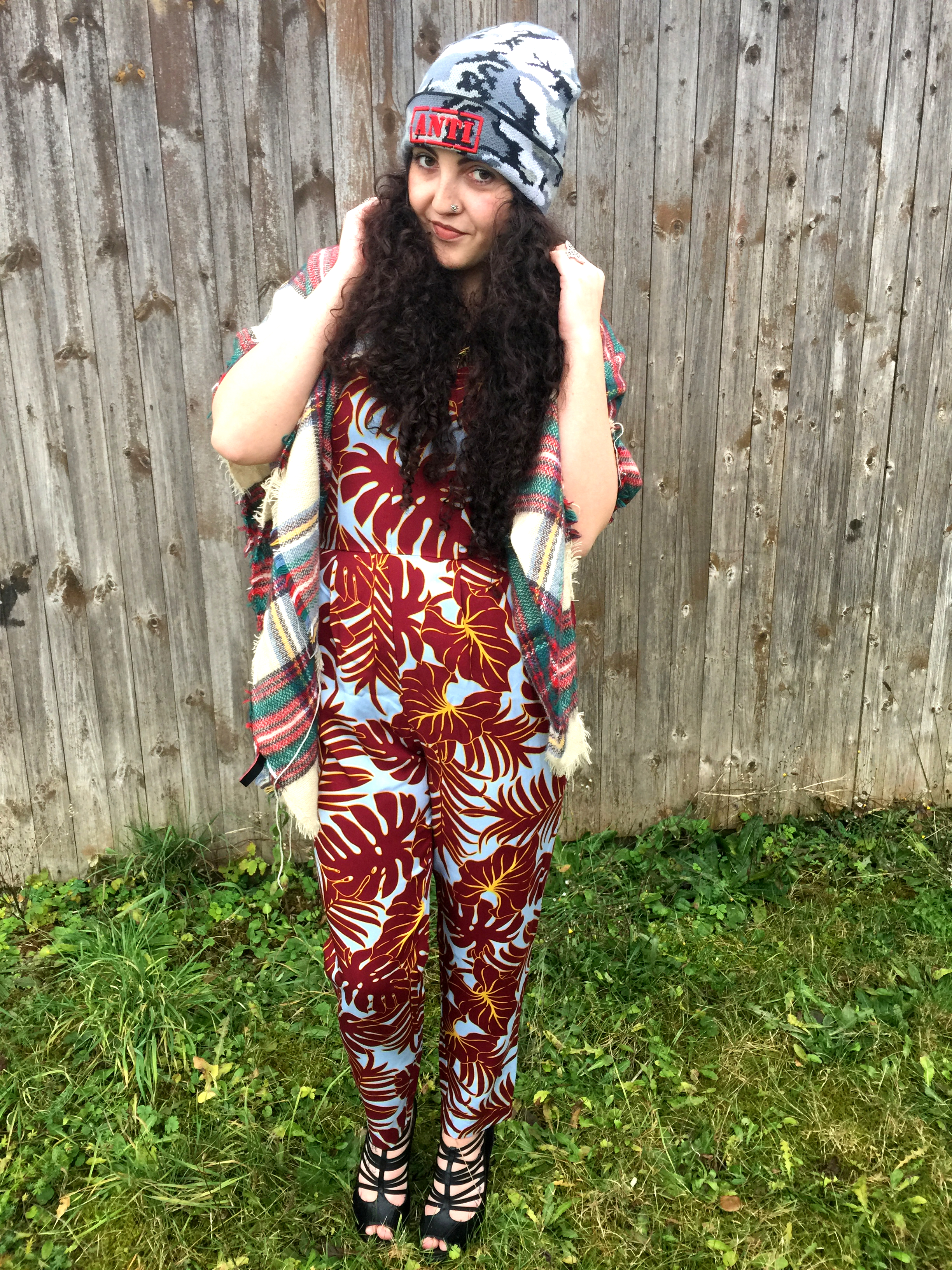 Die schönsten Ponchos kennst du ja bereits von Sunnys letztem Schick in Strick Beitrag. Diese Variante einen Schal zu tragen eignet sich natürlich auch hervorragend zu Strickkleidern. Ich habe mich jedoch für einen Jumpsuit mit auffälligem Muster entschieden. Meine Beanie aus dem Rihanna Merch ihrer ANTI World Tour rundet meinen Look ab.