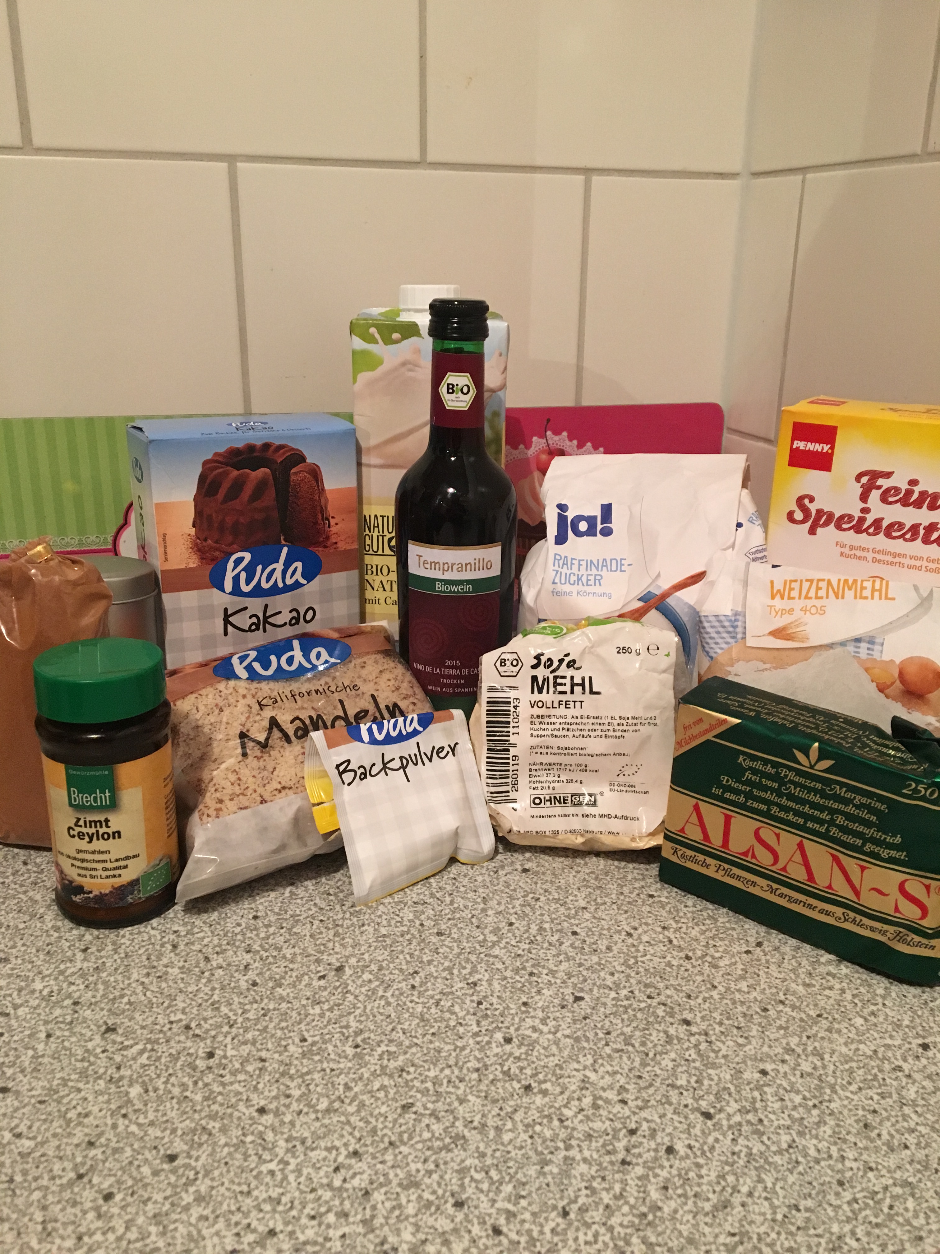 Der Kuchen an sich ist ein schokoladiger Gewürzkuchen mit ein bisschen Rotwein verfeinert. Mittlerweile kann man zum Glück recht einfach vegane Weine im Supermarkt kaufen, ich bin bei Penny fündig geworden. Der Wein verleiht dem Kuchen eine fruchtige Note.