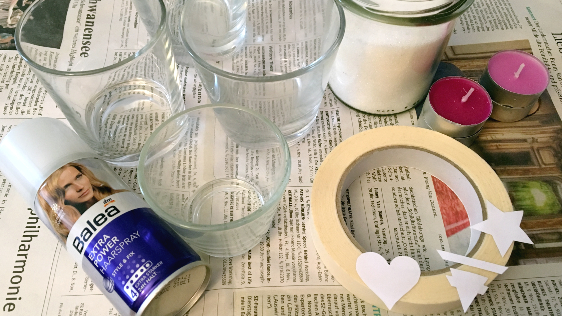 Schneide zunächst die gewünschte Form aus dem Kreppband aus. Ein Herz, Buchstaben, Sterne, Bandlogos wie das von Tokio Hotel. Werde kreativ! Die Vorlage klebst du dann in das Glas. Anschließend besprühst du das Glas mit ordentlich Haarspray. Gib sofort Zucker in das Glas und drehe es solange, bis alles gut mit dem Zucker bedeckt ist. Lasse alles gut trocknen, ehe du das Teelicht in das Glas gibst. Es sollte aber nicht lange dauern, bis du das Licht anzünden kannst.