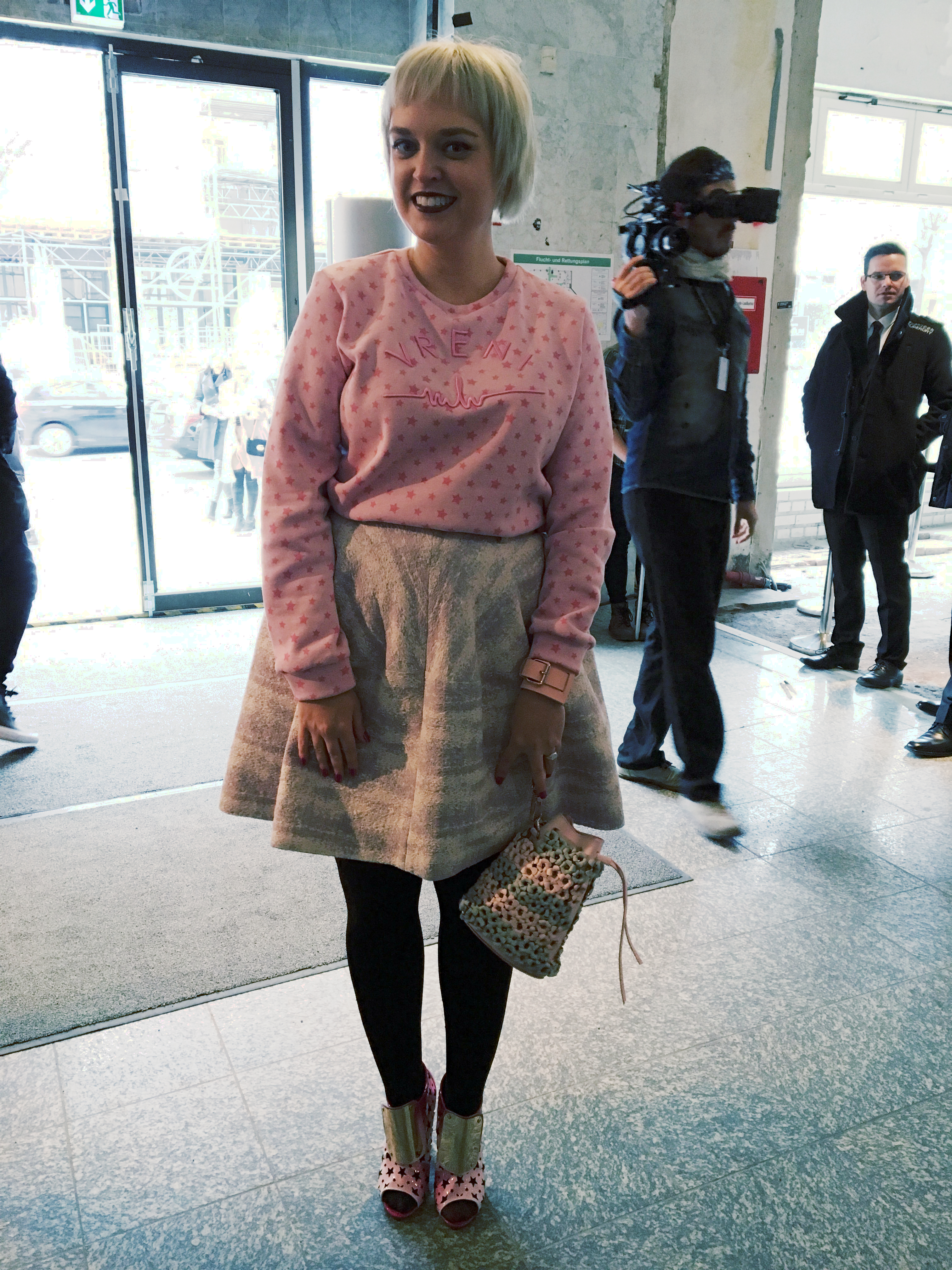 Mit ihrem pinken Girly Look und ihrer positiven Attitude ist sie uns sofort ins Auge gestochen: Bloggerin Vreni Frost. Ihre raffinierte Kombination aus Sportlichkeit und Eleganz wird durch die durchdachte Farbwahl stimmig. Entdeckt man untenrum den hellen High Waist Rock, der perfekt mit ihrer Haarfarbe harmoniert, und die extravaganten High Heels, präsentiert sie sich obenrum sportlich und feminin. Sie trägt ihren eigenen Vreni Pullover in einem süßen rosa, der durch die pinken Sterne das Thema der Schuhe wieder aufgreift. Die Jeffrey Campbell Peeptoes mixen gleich 4 Trends: angesagtes pastel pink, ein Ombre hin zu einem kräftigeren Pinkton, glänzende Metallic Momente in Gold und das bereits erwähnte Cut Out in Sternform.