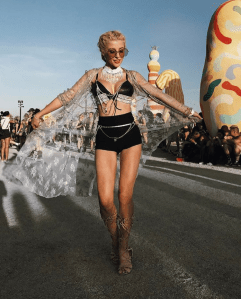 Um zu wissen, dass Jayme die Lady Gaga Show besucht hat, muss man nicht erst auf ihr Instagram Profil schauen. Ihr rockiger Style erinnert stark an den der Sängerin und Modeikone. All in black ist das Motto: schwarzes Meshkleid über schwarzem Body aus der H&M loves Coachella Kollektion, schwarzer großer Hut und natürlich schwarze Boots. Die große Sonnenbrille macht sie dann noch so richtig Gaga!