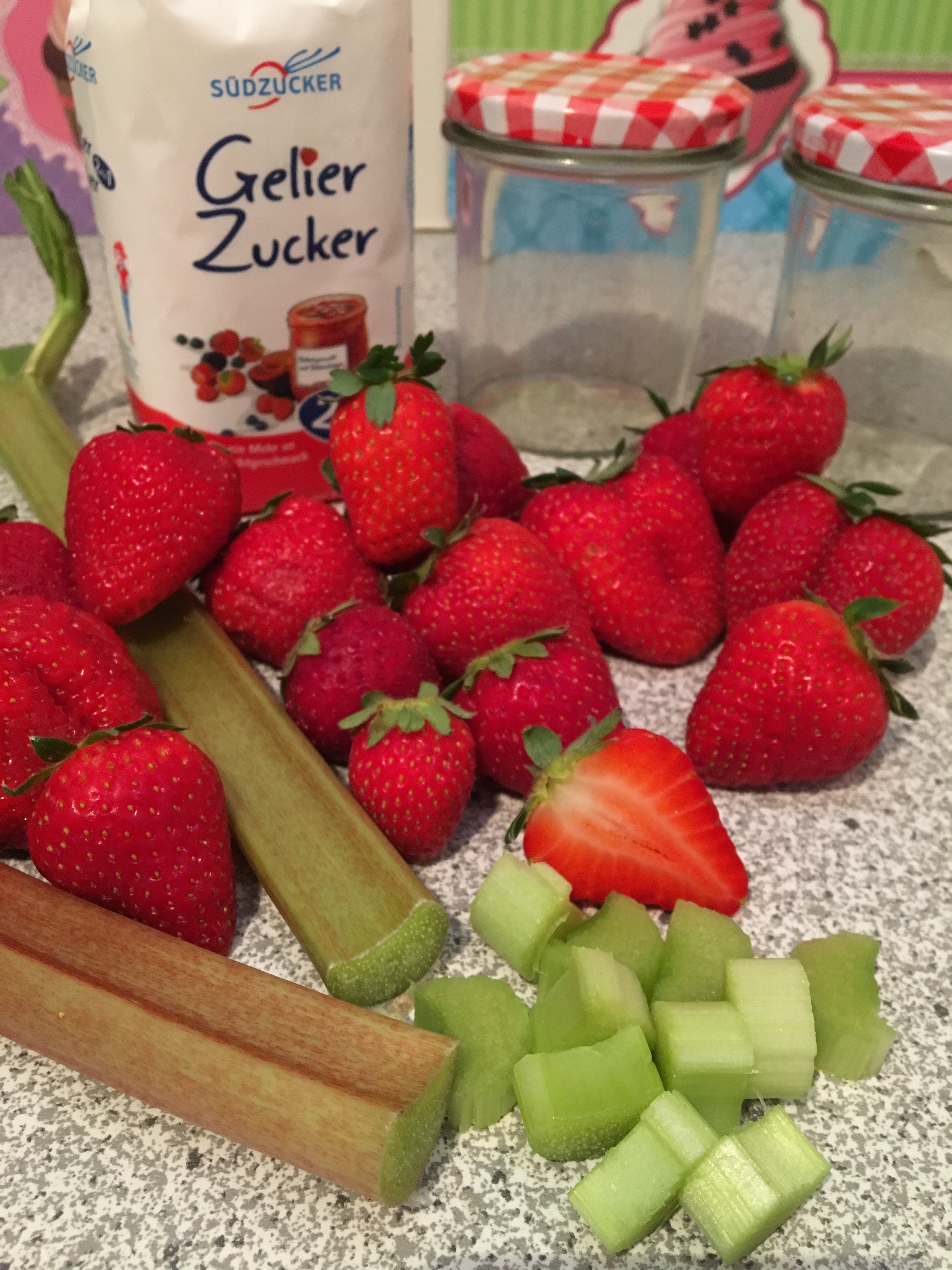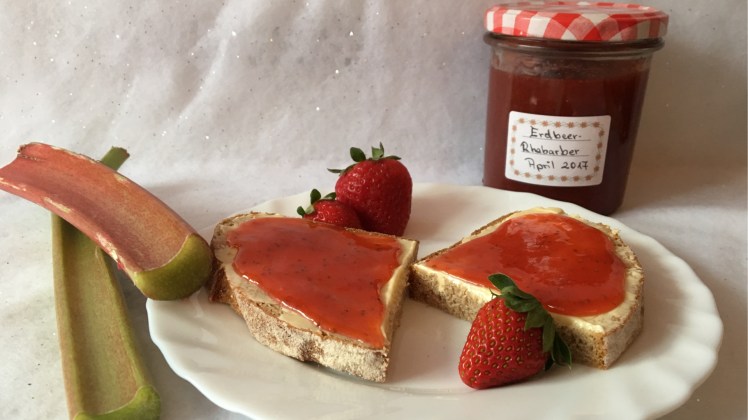 Aus Rhabarber kann man ja viel machen. Kompott, Kuchen, Crumble oder eben auch als leckere Kombi mit Erdbeere in Marmelade. Dieses Rezept reicht für etwa 4 Gläser.
