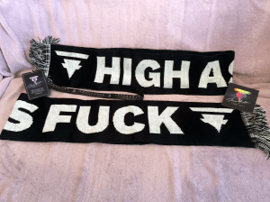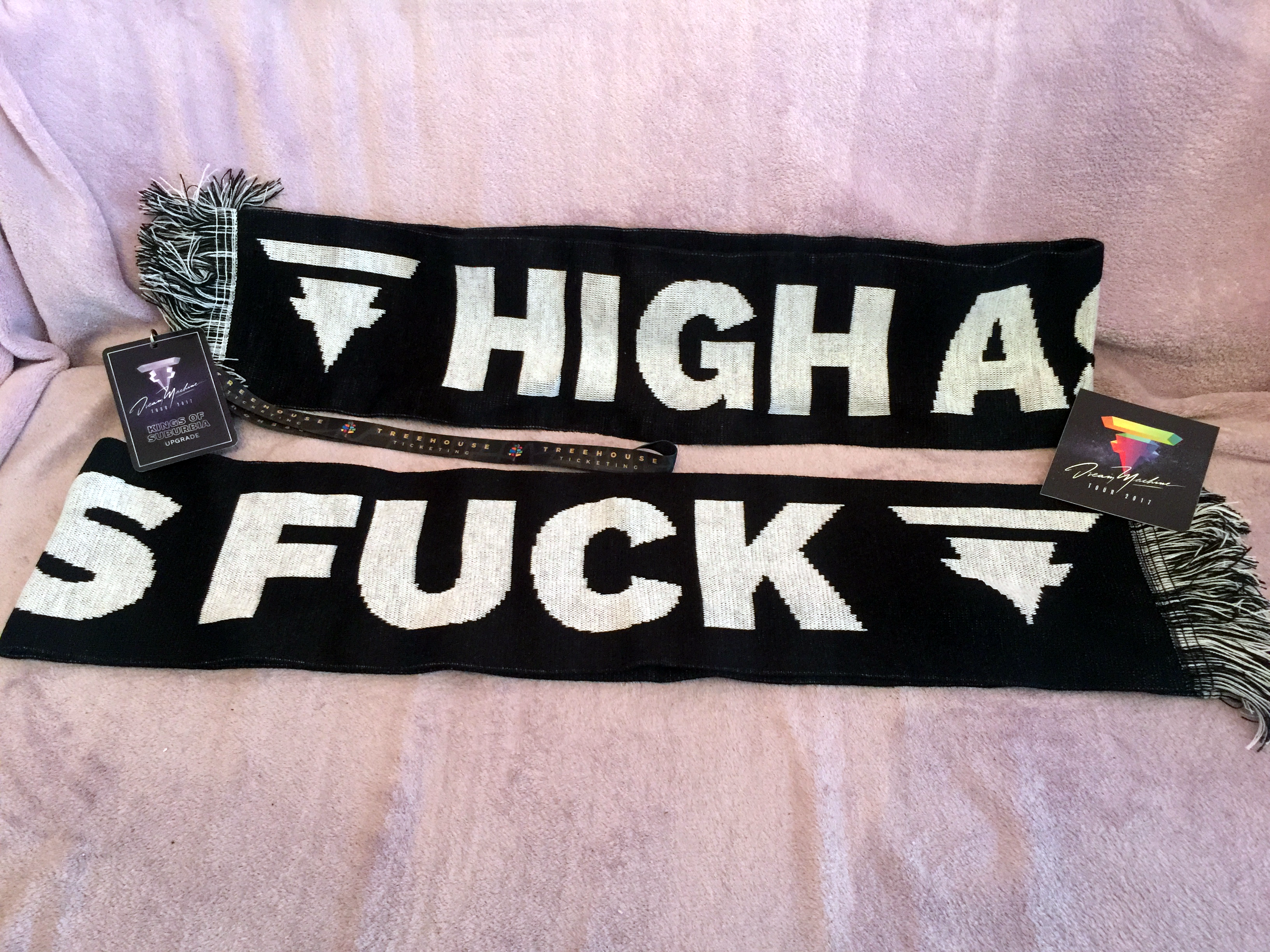 Neben dem offiziellen Merch, das es im Onlineshop und auf Konzerten zu kaufen gibt, erhältst du mit den Treehouse Ticketing VIP Upgrades auch nochmal exklusive Goodies. So bekommt jeder Upgrader einen Tokio Hotel Sticker und ein Tour Laminate und für HUMANOID und KOS gibt es zusätzlich noch einen High As Fuck Schal.