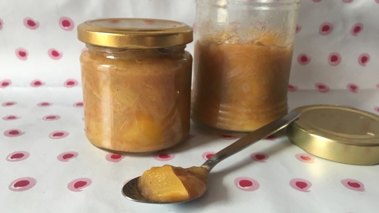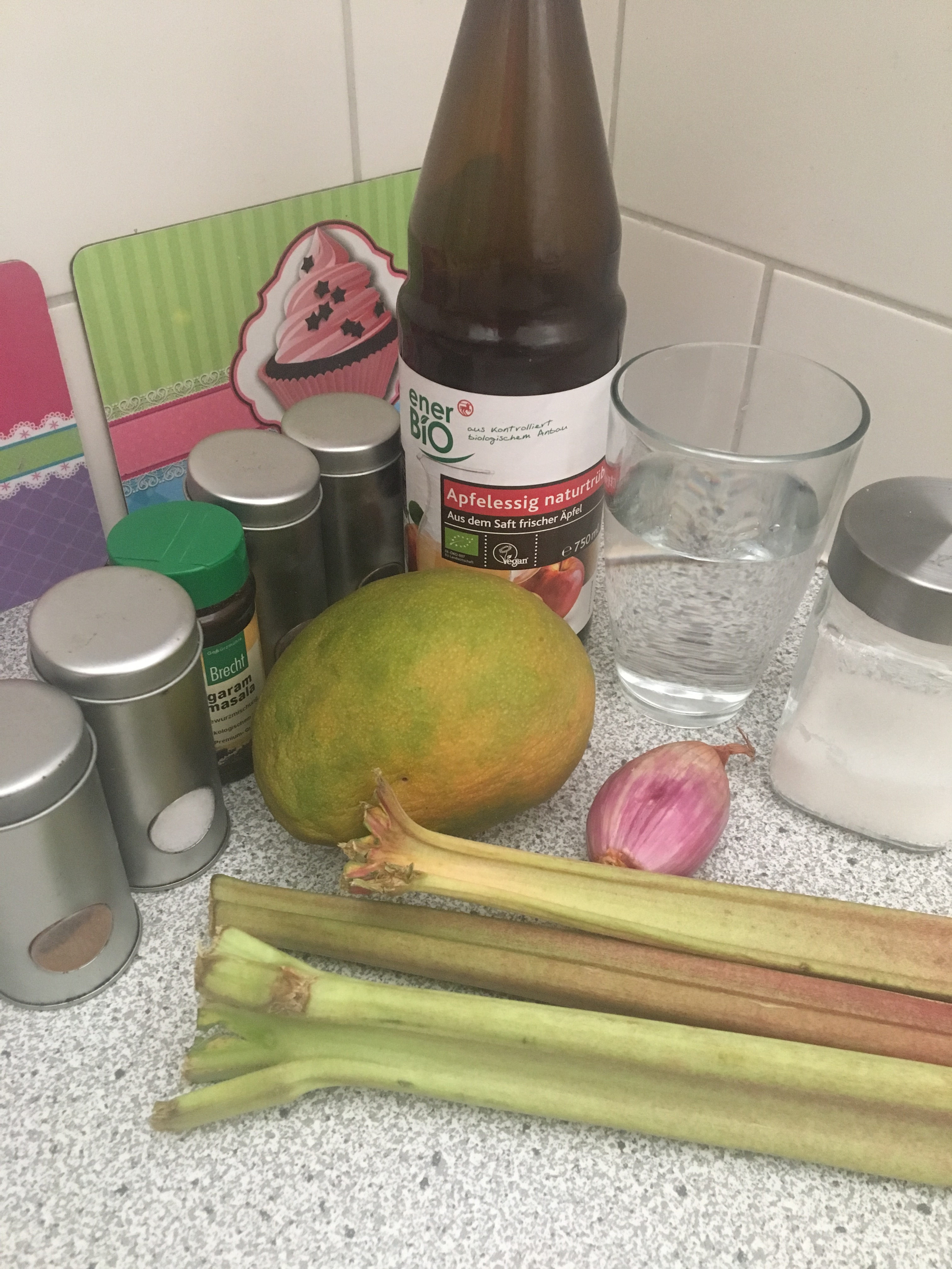 Das Besondere an Chutney ist die geniale Kombination aus süß und sauer. Ursprünglich aus Indien stammend ist der raffinierte Dip schon lange auch hier sehr beliebt. Die europäische Version besteht aus Gemüse oder Früchten, die mit Zucker und Essig eingekocht werden. Dabei kann jeder nach eigenem Geschmack entscheiden. Es macht richtig Spaß, neue Variationen auszuprobieren. Da jetzt noch Rhabarberzeit ist, wollte ich das natürlich nutzen. Denn das Gemüse kann man eben nicht nur für Süßes wie Marmelade oder Crumble verwenden. Auch im Chutney macht es sich sehr gut. Zum sauren Rhabarber passt Mango hervorragend. Und durch die Auswahl der Gewürze bekommt das Chutney dann noch einmal eine individuelle Note.