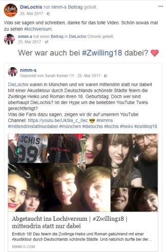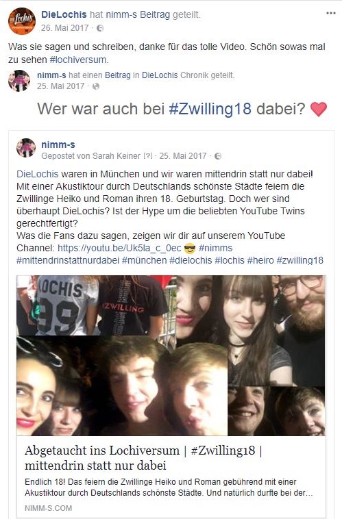 Kaum haben wir uns wieder ein bisschen akklimatisiert und nach der langen Konzertreise wieder in den Alltag eingefunden, traten die Lochis in unser Leben. Diese Story ist die verrückteste des Jahres 2017. Angefangen hat alles mit dem Konzert in München im Rahmen der #Zwilling18 Akustik Tour. Hier wollten wir berichten und uns einen Eindruck verschaffen, wer denn Heiko und Roman Lochmann sind, was die so machen und wie ihre Fans so drauf sind. Ganz wichtig ist uns dabei immer, möglichst ohne Vorurteile an so etwas ranzugehen. Dass uns die Zwillinge aber so von sich überzeugen würden, hätten wir wohl nie gedacht! Sympathisch, fleißig, selbstironisch, motiviert und motivierend (!), humorvoll und balla-balla sind nur einige Worte, die uns zu den beiden Energiebündeln einfallen. Aus der anfänglichen Neugier wurde im Laufe der Zeit immer größere Faszination für zwei bodenständige Multitalente, die mit ihren 18 Jahren bereits so viel erlebt und eine enorme Entwicklung durchgemacht haben. So prägend wie das Konzerterlebnis und die Berichterstattung waren haben die Lochis selbst dem ganzen noch die Krone aufgesetzt, indem sie uns wissen ließen, wie gut ihnen unser Video und der Beitrag gefallen und das auch auf Facebook teilten.