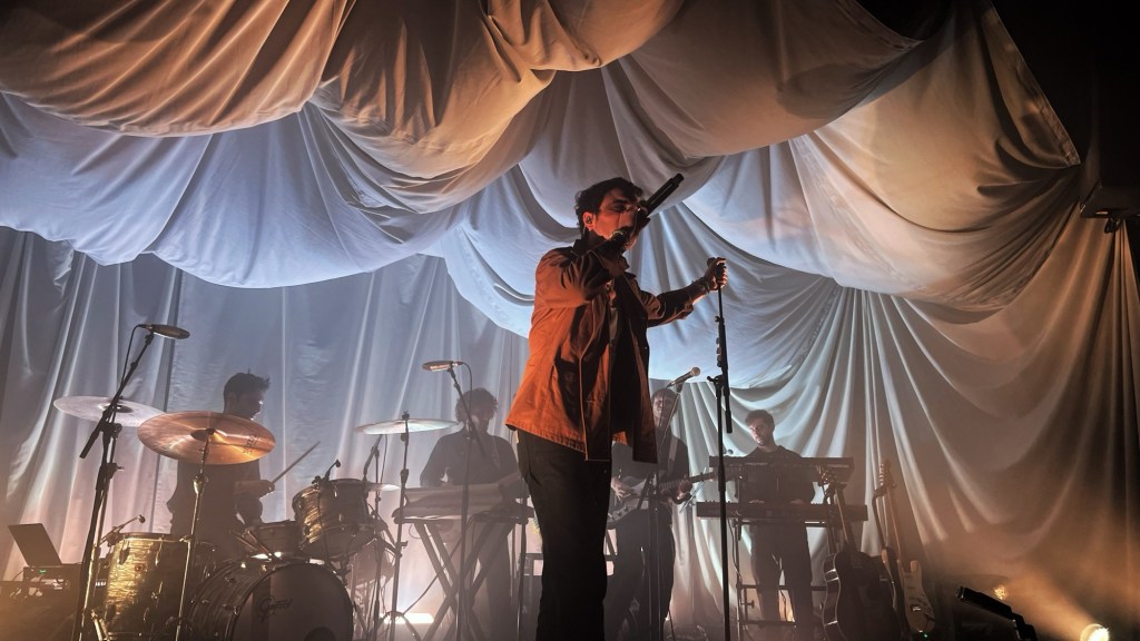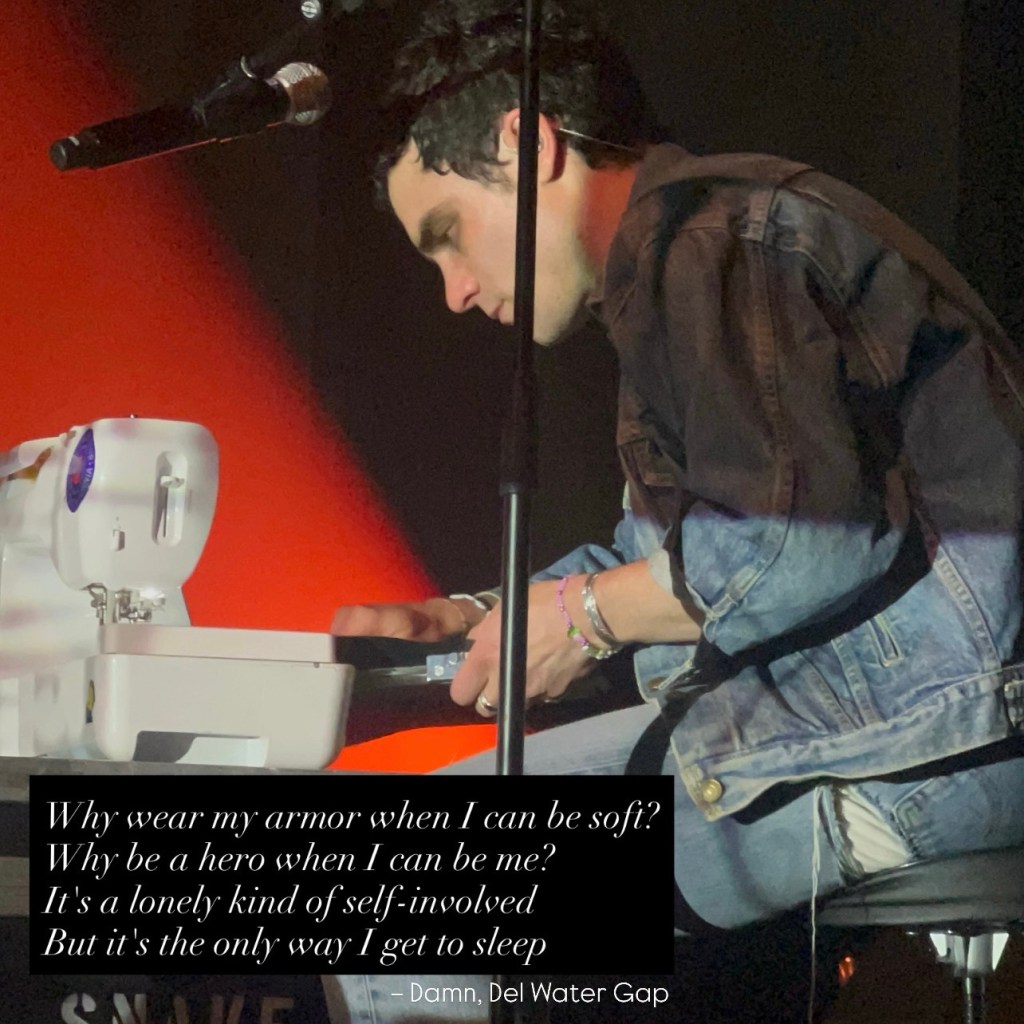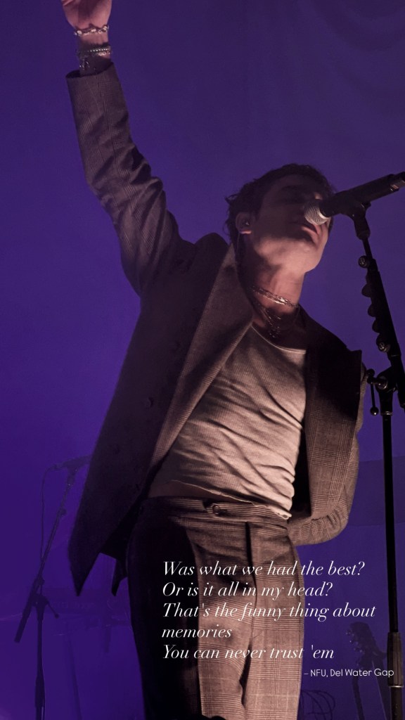 Die erste größere Ansprache. Holden erzählt, was er in der Stadt gemacht hat. Er war beispielsweise in der Manchester Library und in Brighton auf einem Friedhof (okay). Die Ansprache ist ebenfalls Zeit für Interaktion mit den Fans. In Manchester sieht er ein Irn Bru, das ein Fan reingeschmuggelt hat. Ein witziger Callback zu seinem Konzert zuvor in Glasgow. Die Stimmung ist weiterhin hervorragend und dann folgt auch schon mein persönliches Highlight: »Ghost in the Uniform«. Ich weiß nicht, wie oft ich den Song schon gehört habe und kann bereits jetzt sicher sagen, dass das mein Spotify Wrapped Nr. 1 sein wird. Aber das Gefühl, deinen Lieblingssong zum ersten Mal live zu hören, ist einfach unbeschreiblich. Die Gänsehautstimmung wich auch beim folgenden Song »NFU« nicht. Del Water Gap wie seine Fans singen die herzzerreißende Hymne aus tiefstem Herzen mit.